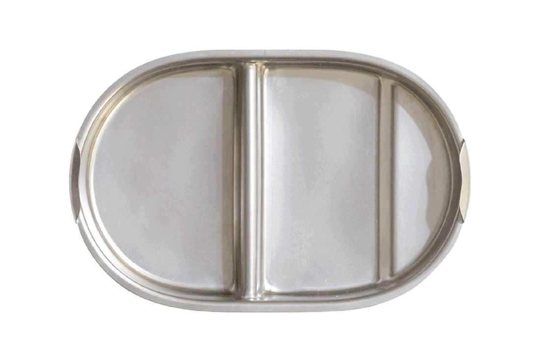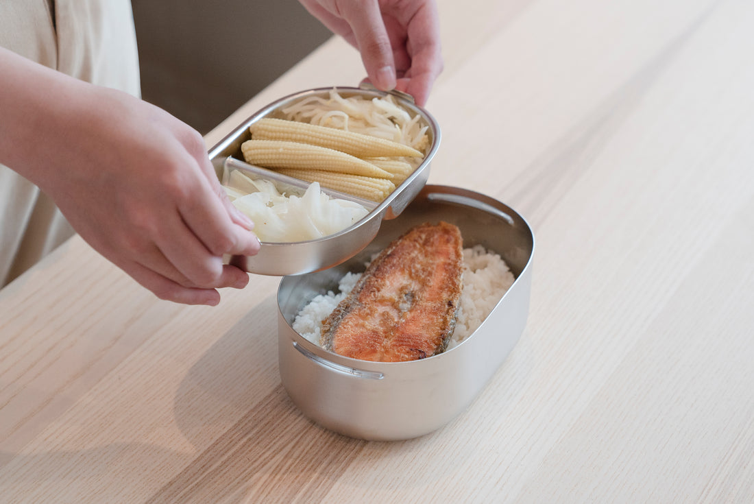 用一片鋼板壓製出菜盤的分隔與提把讓食物排排站,味道不混雜