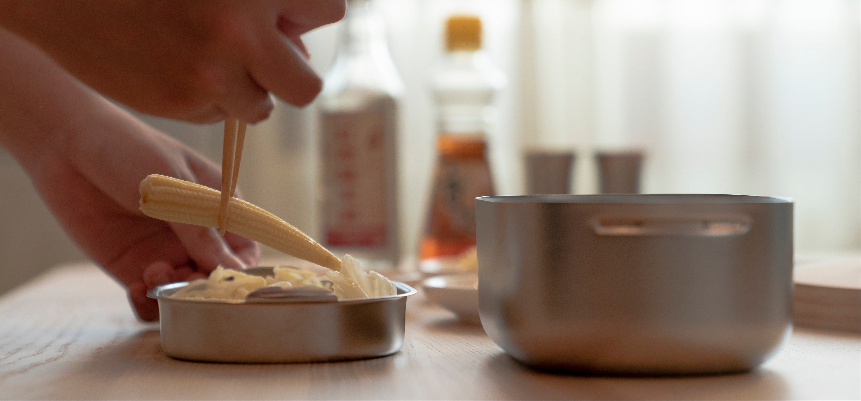 用一片鋼板壓製出菜盤的分隔與提把讓食物排排站,味道不混雜