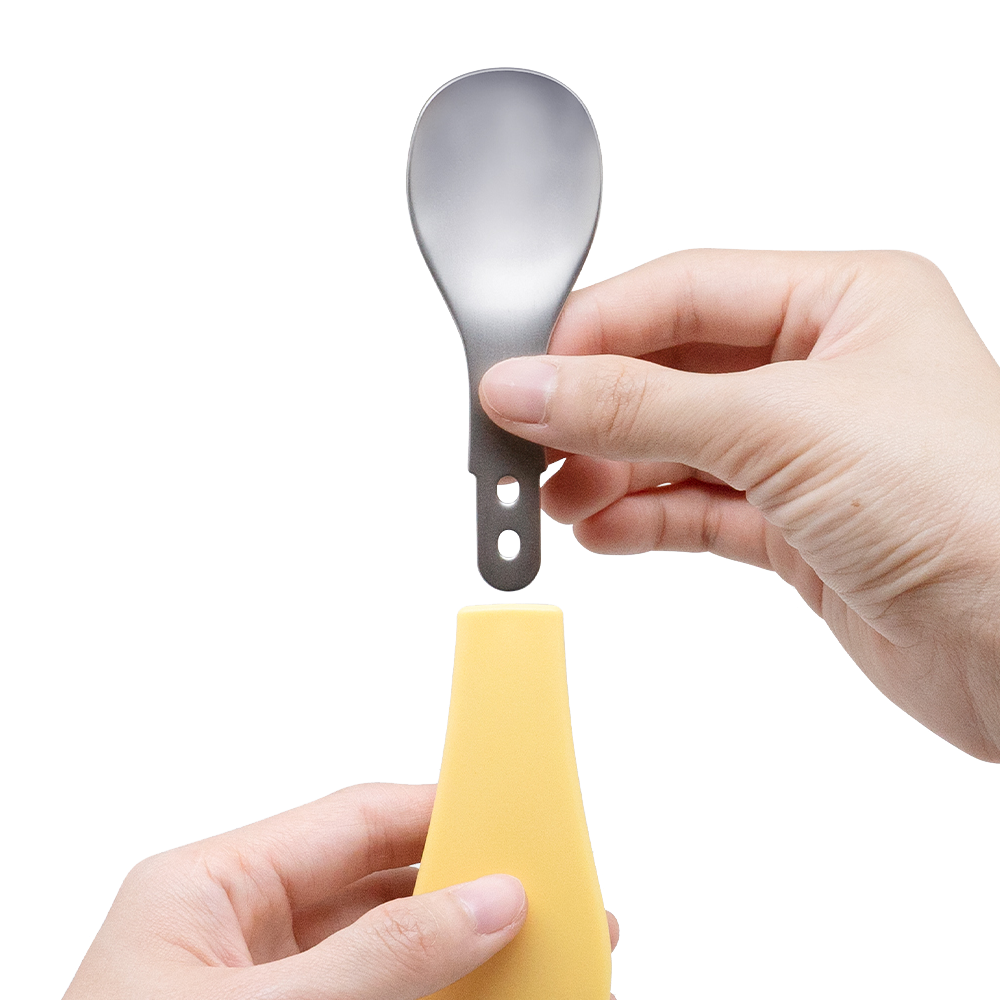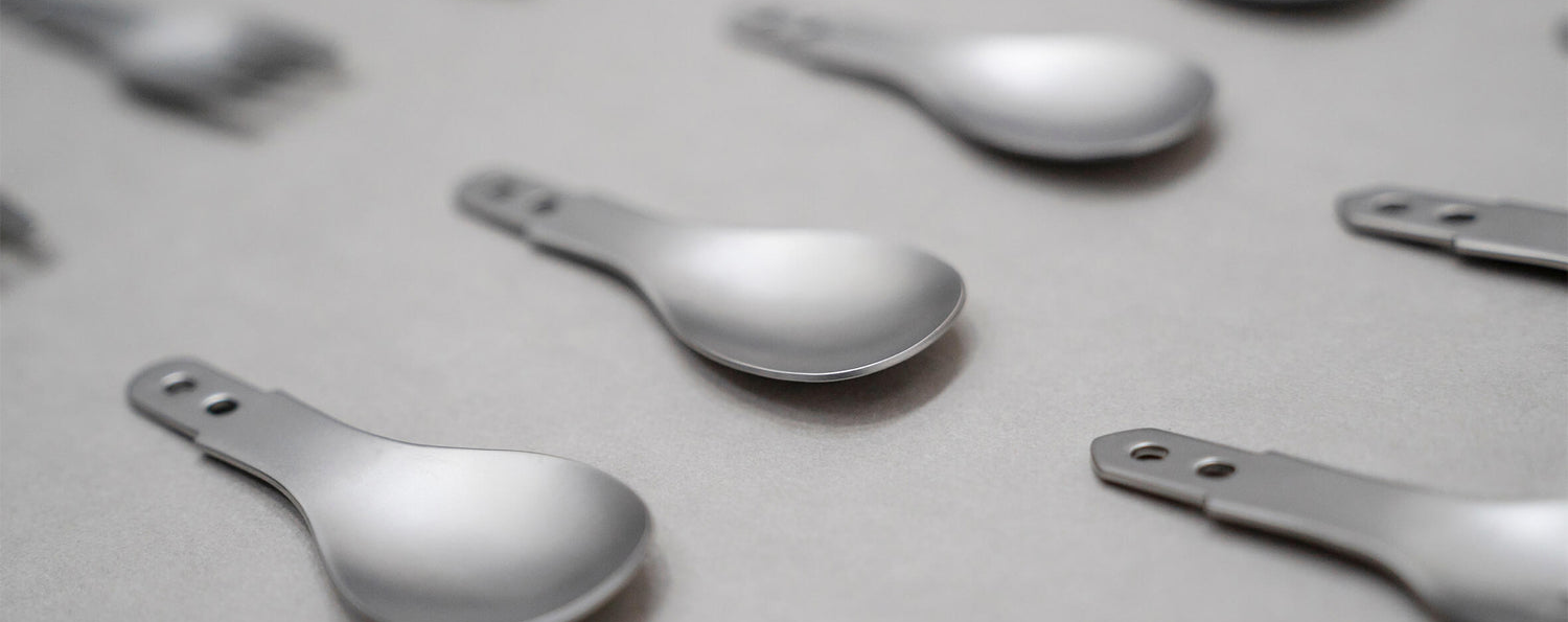 湯匙與叉子採用304不鏽鋼材質,表面經過噴砂處理,展現細緻霧面質感。握柄和小帽採用塑膠回收系統最成熟的5號PP聚丙烯,當使用一段時間零件自然損耗,可以被回收再製成二次塑膠原料、作為其他非食品容器使用。