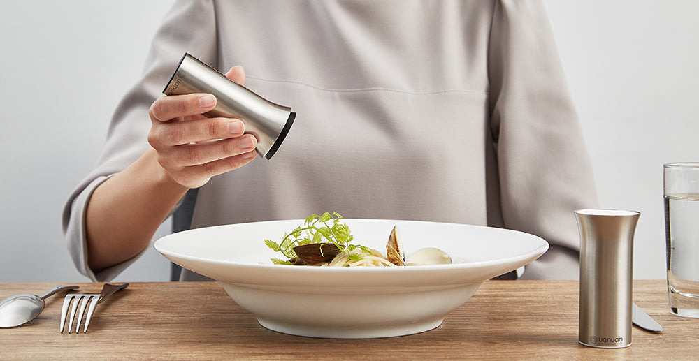 建議使用研磨製成的粗粒黑胡椒,以及一般家庭使用的食用細鹽(精鹽),這樣的顆粒尺寸最能讓你輕鬆倒出理想的調味量哦!